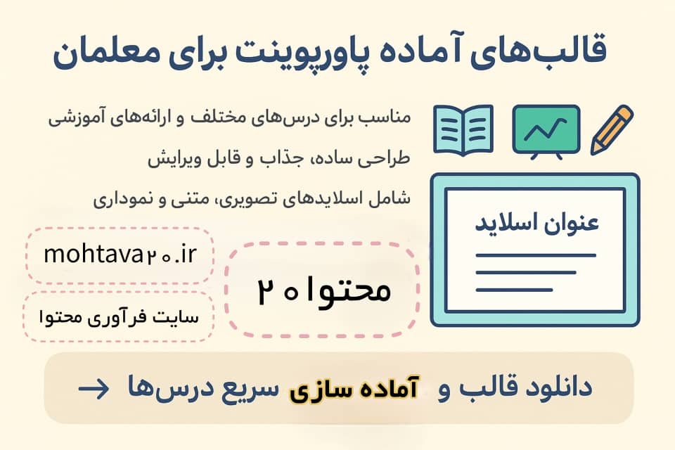 اگر به‌عنوان معلم قصد دارید ارائه‌ای حرفه‌ای، سریع و جذاب بسازید، قالب‌های آماده پاورپوینت بهترین انتخاب هستند. این قالب‌ها وقت شما را ذخیره می‌کنند، کیفیت تدریس را بالا می‌برند و ارائه‌ای منظم و چشم‌نواز به شما می‌دهند. کافی است قالب مناسب را انتخاب کنید، متن خود را وارد کنید و اسلایدتان آماده است.