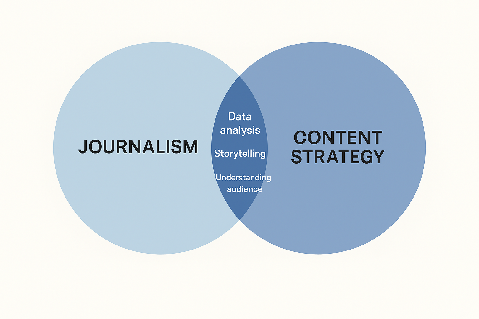 Journalism and content strategy have a lot in common, especially for journalists who work in the reporting and narrative sectors. This slide, created by artificial intelligence, clearly shows the common ground between the two. Content Analysis – Storytelling – Audience Understanding